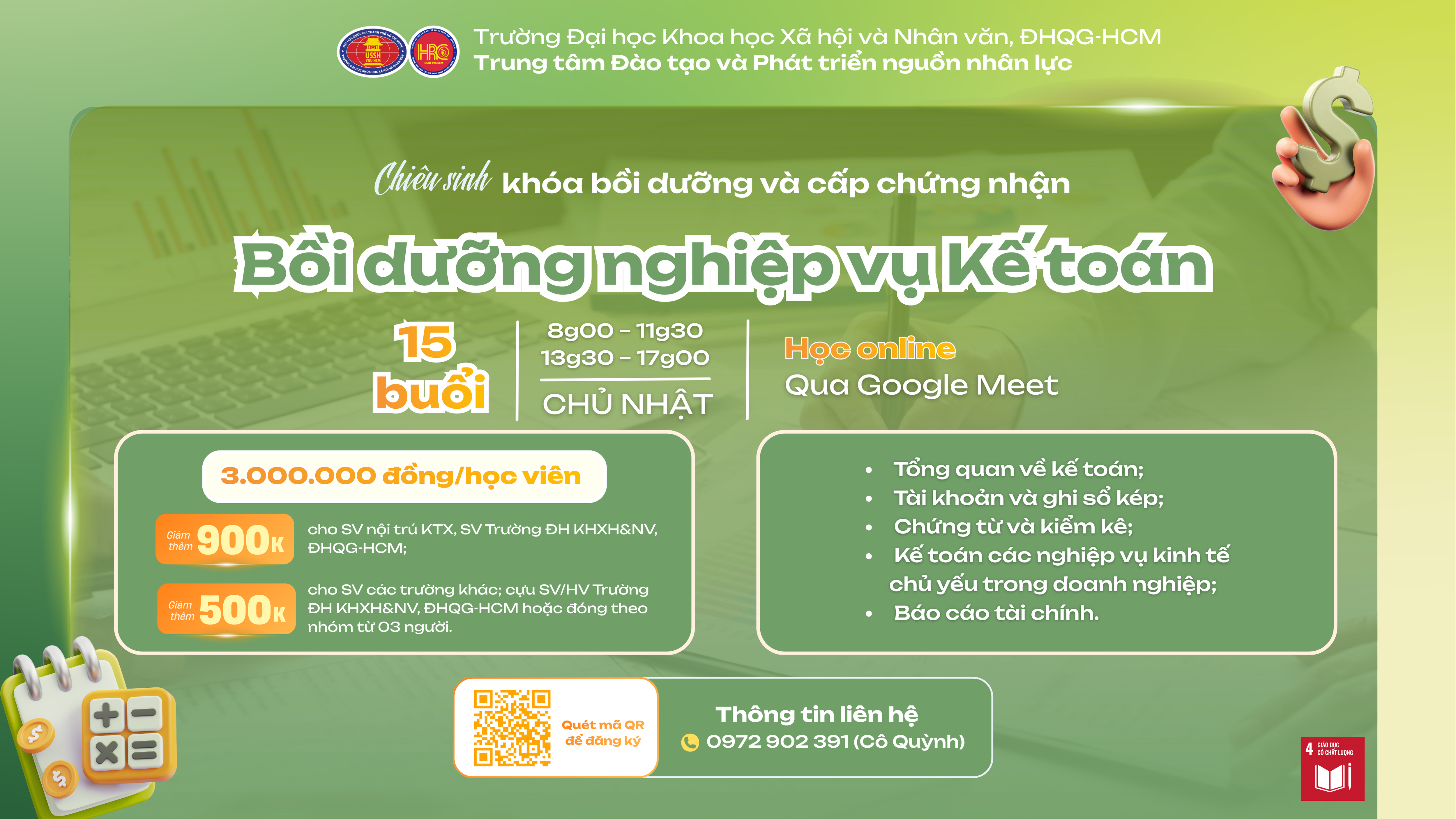 – Sinh viên Trường ĐH KHXH&NV: giảm 30% còn 2.100.000đ/học viên