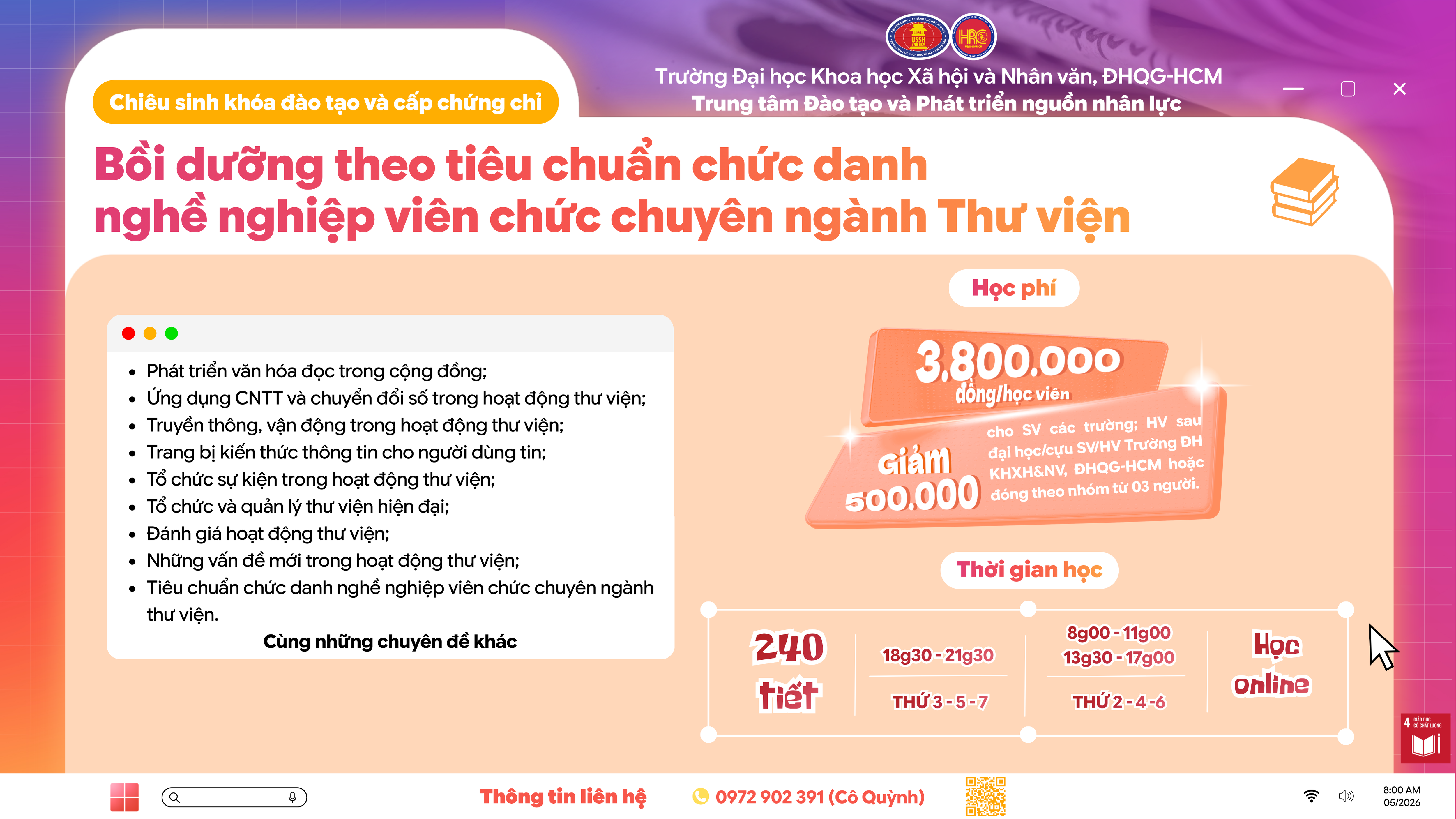 Bồi dưỡng theo tiêu chuẩn chức danh nghề nghiệp viên chức chuyên ngành Thư viện (Khóa 4) – Dự kiến khai giảng 20/06/2026