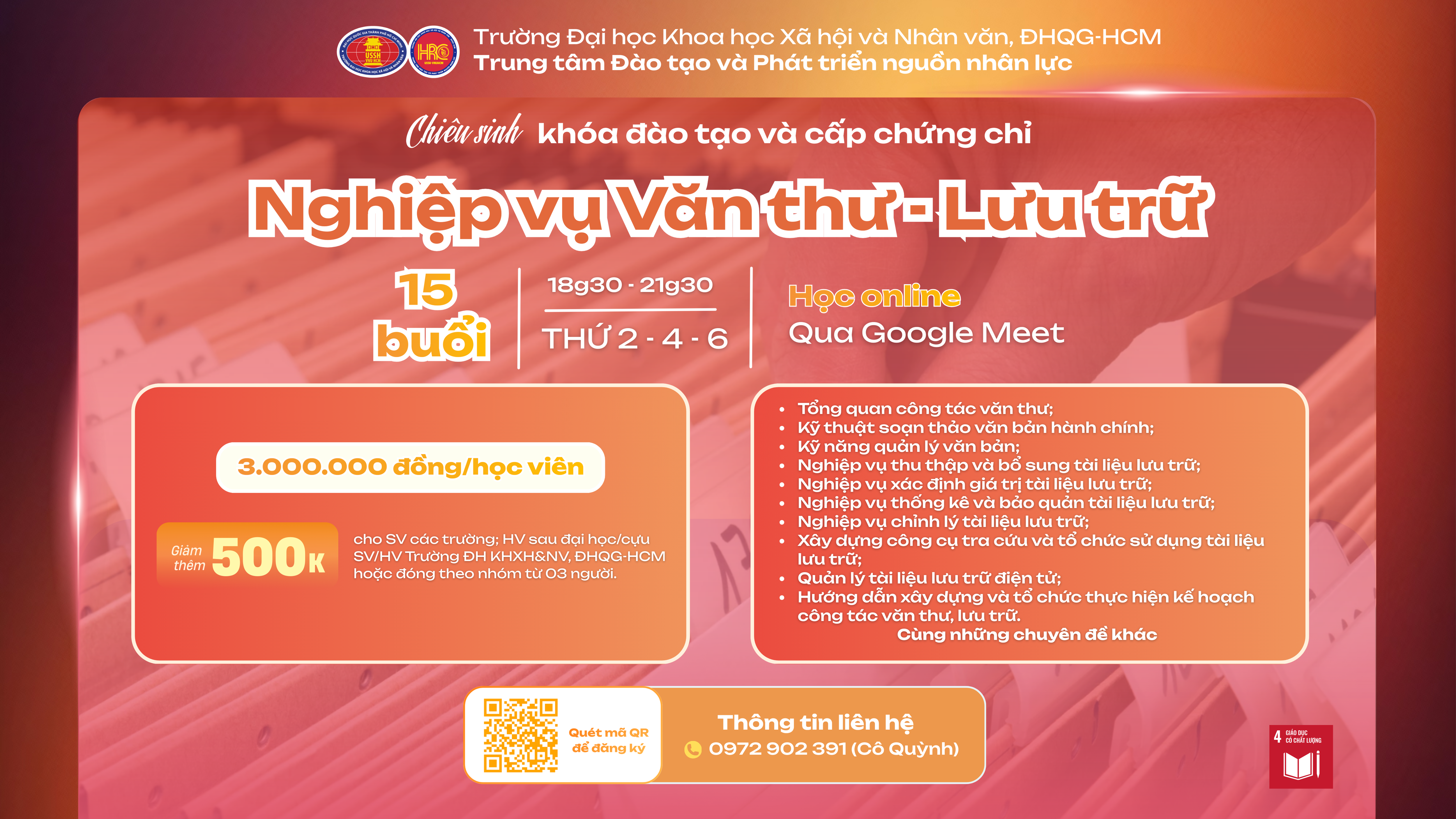 THÔNG TIN KHÓA ĐÀO TẠO NGHIỆP VỤ VĂN THƯ – LƯU TRỮ