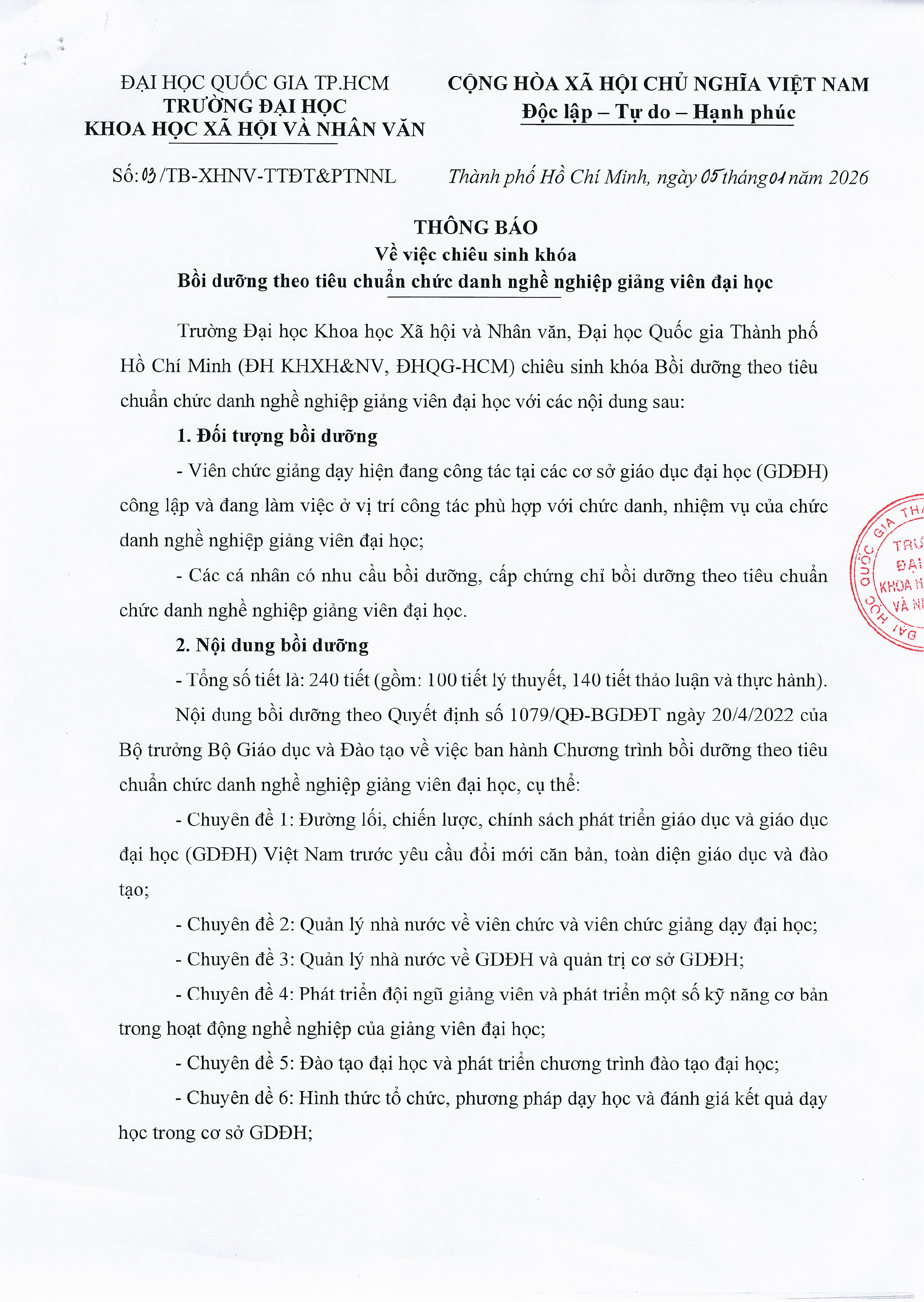 Thông báo về việc chiêu sinh khóa Bồi dưỡng theo tiêu chuẩn chức danh nghề nghiệp giảng viên đại học năm 2026