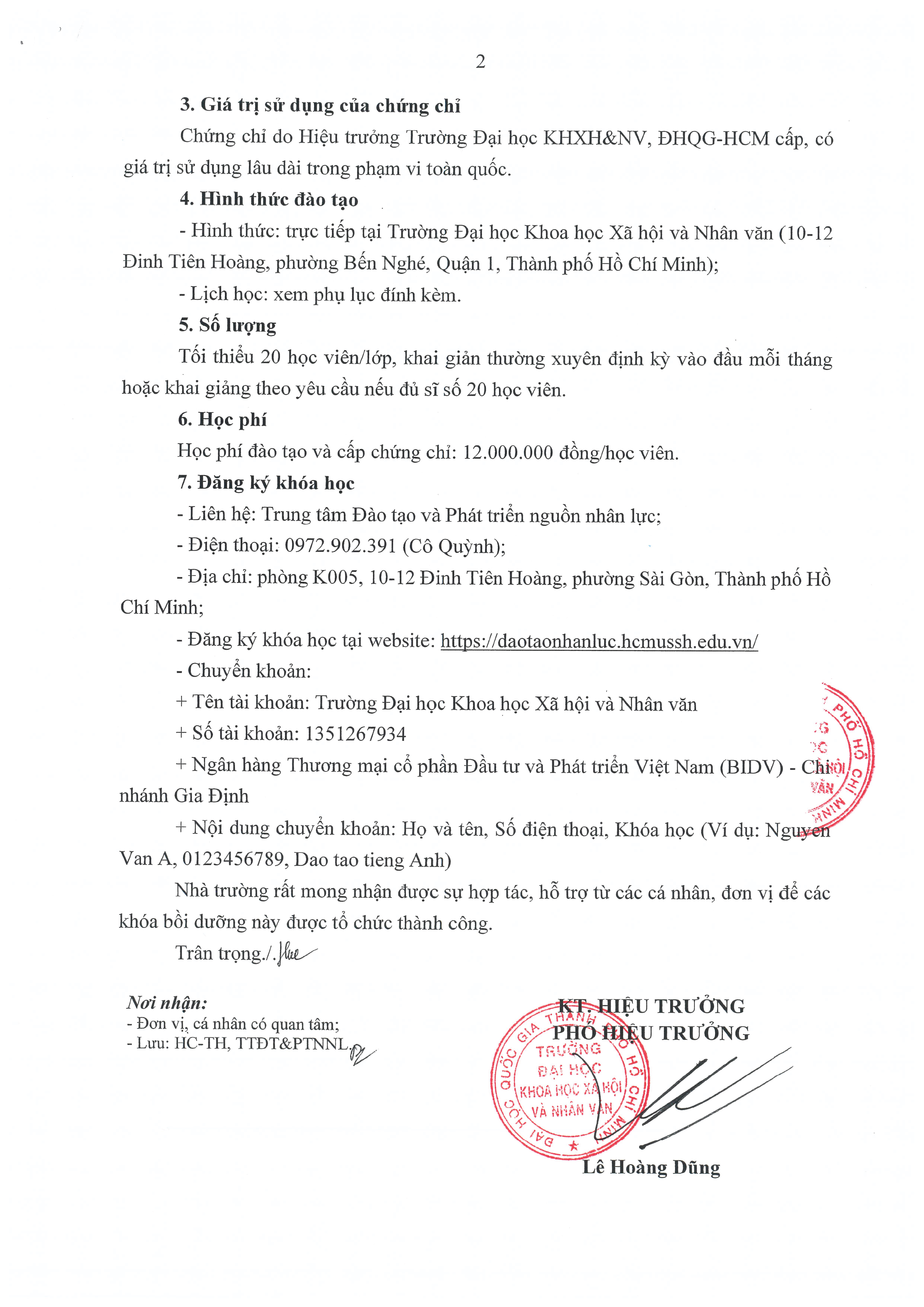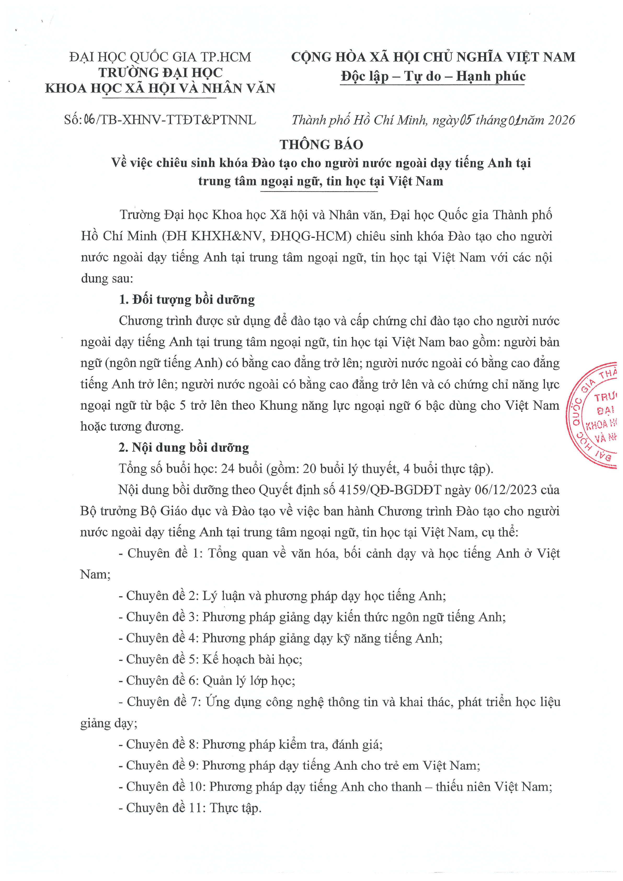 Thông báo về việc chiêu sinh khóa Đào tạo cho người nước ngoài dạy tiếng Anh tại trung tâm ngoại ngữ, tin học tại Việt Nam năm 2026