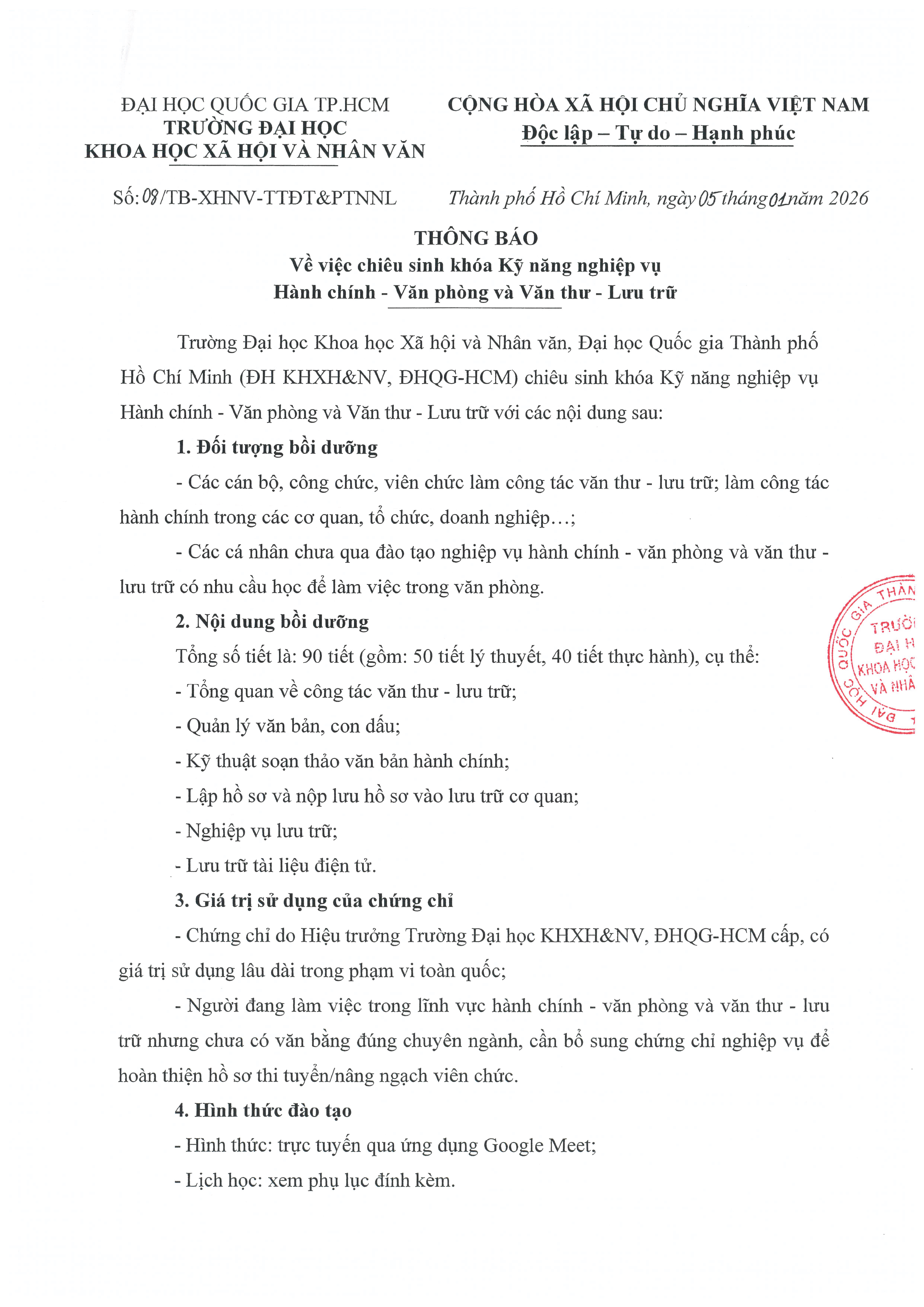 Thông báo về việc chiêu sinh khóa Kỹ năng nghiệp vụ Hành chính – Văn phòng và Văn thư – Lưu trữ năm 2026