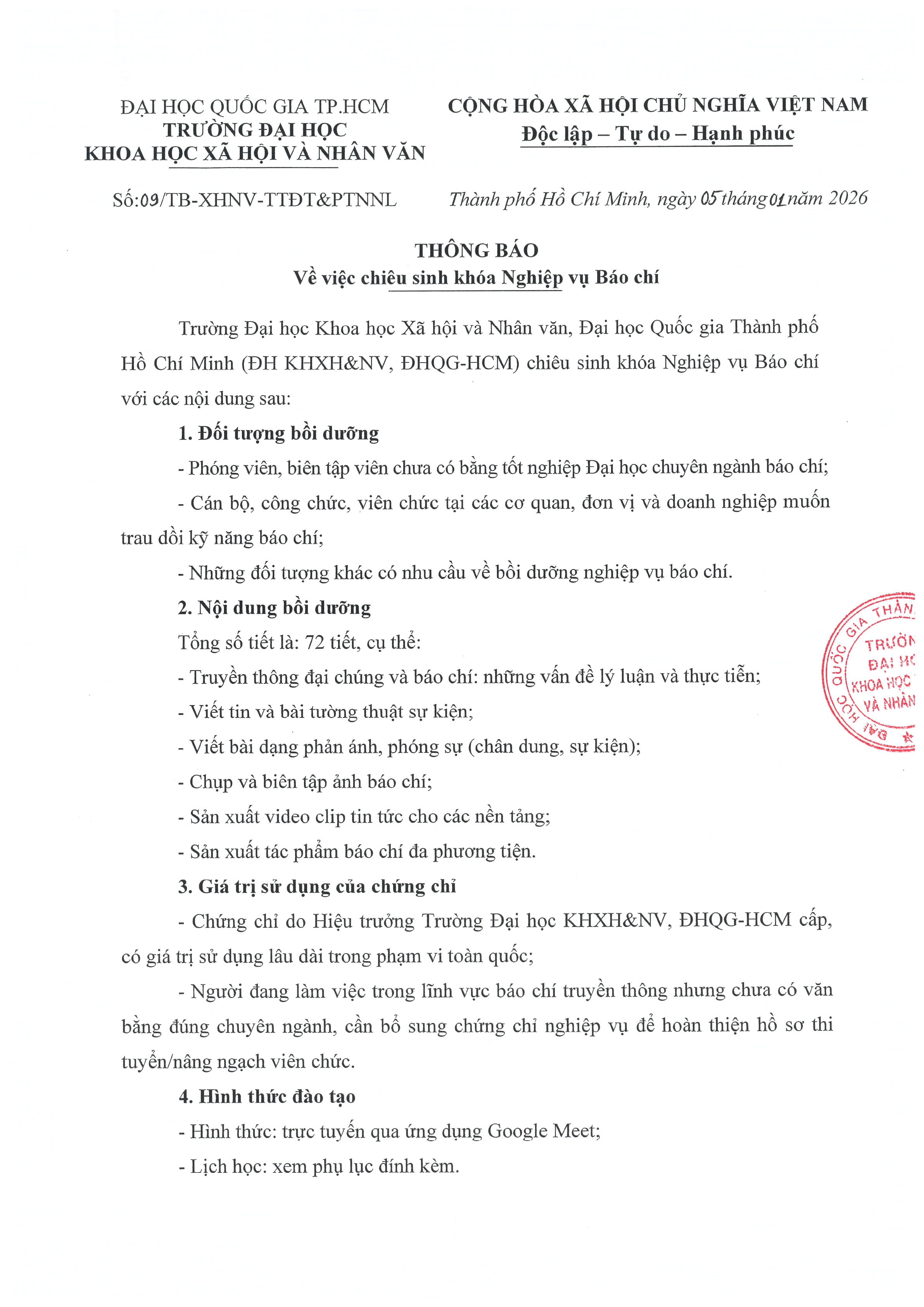 Thông báo về việc chiêu sinh khóa Nghiệp vụ Báo chí năm 2026