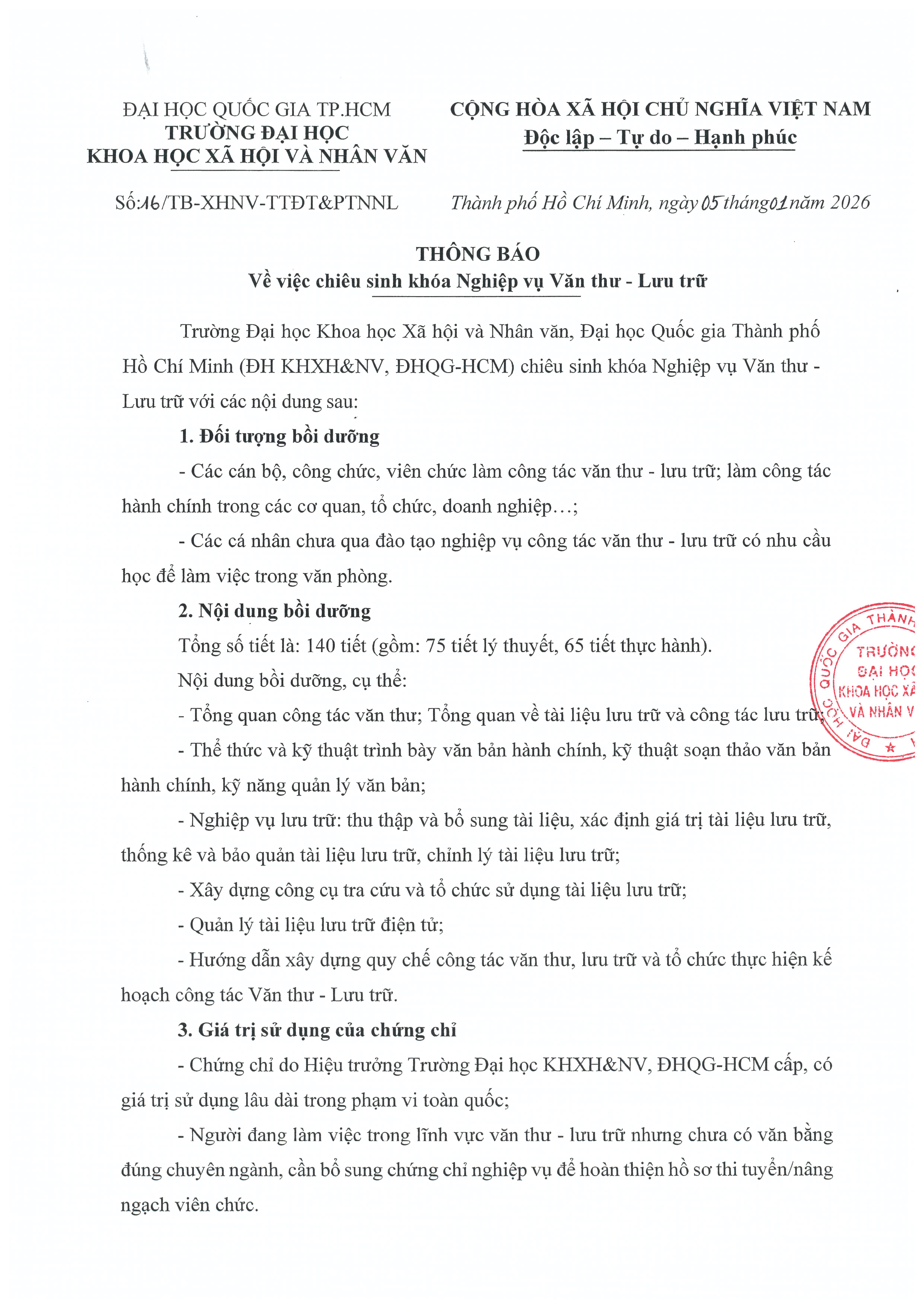 Thông báo về việc chiêu sinh khóa Nghiệp vụ Văn thư – Lưu trữ năm 2026