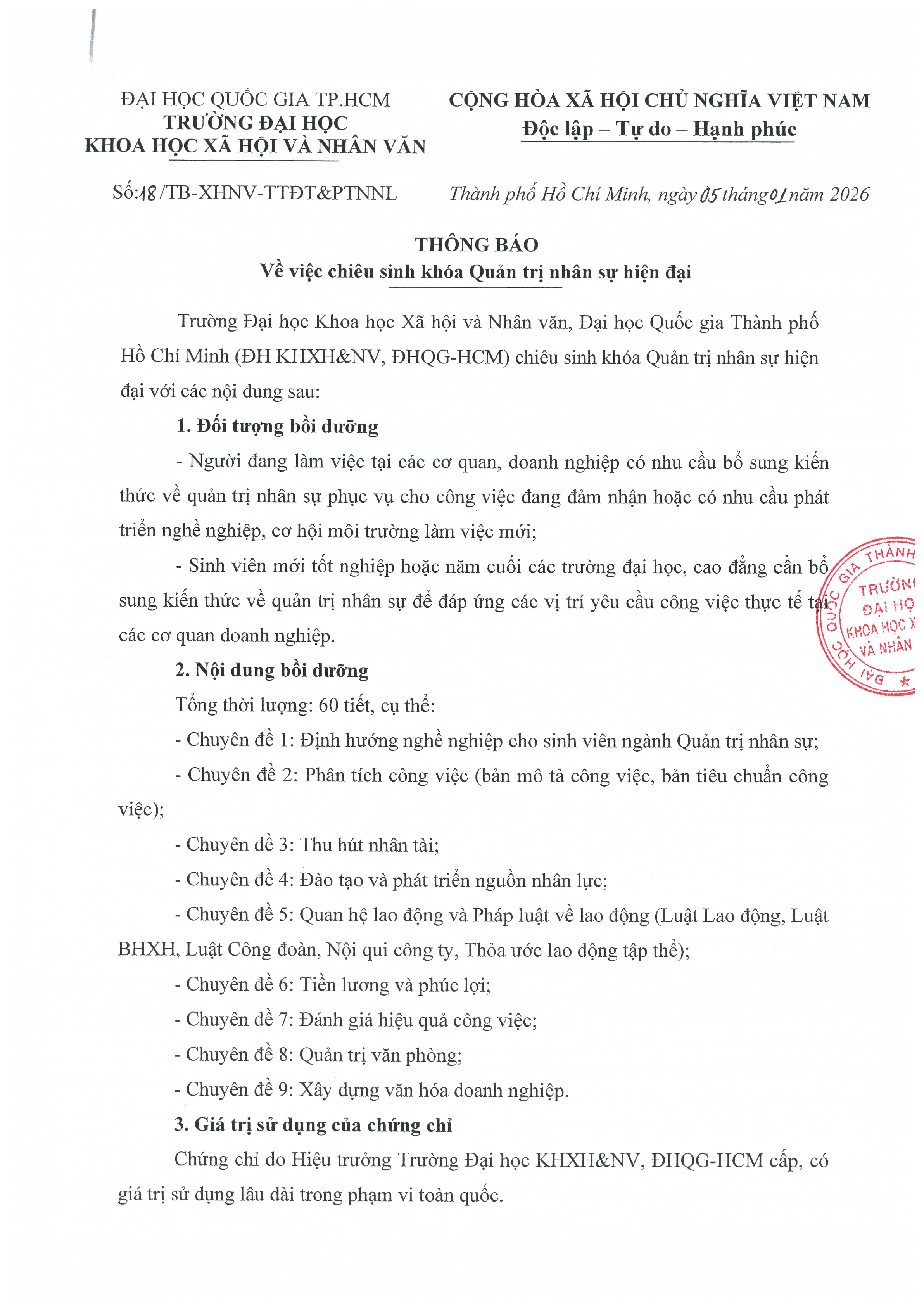 Thông báo về việc chiêu sinh khóa Quản trị nhân sự hiện đại năm 2026